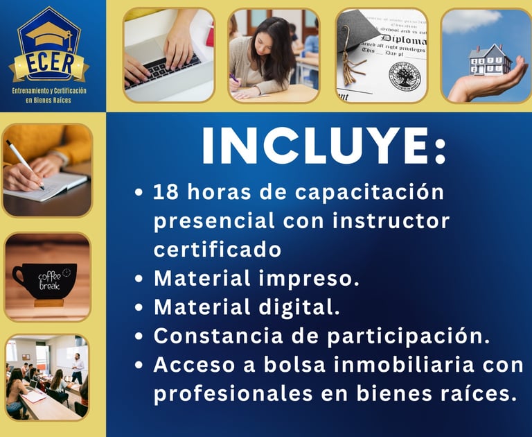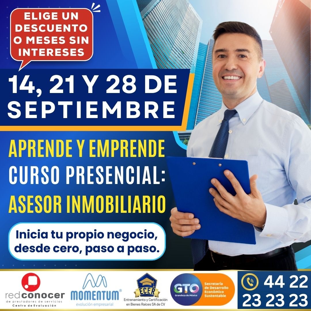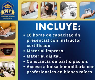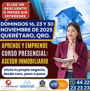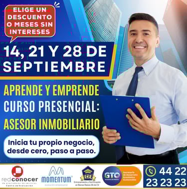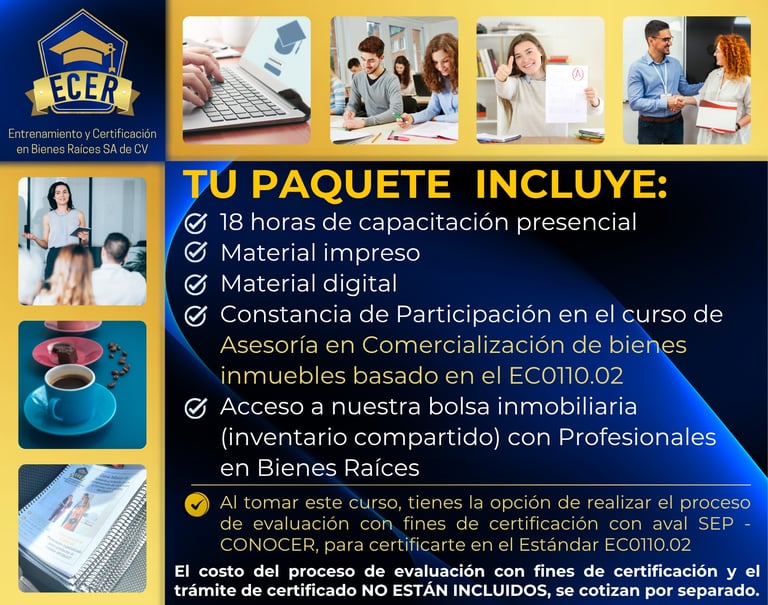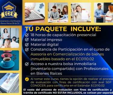 Curso con apego a las Leyes Mexicanas y basado en el Estándar de Competencia Laboral EC0110.02 "Asesoría en Comercialización de Bienes Inmuebles", con opción a Certificación avalada por la SEP y el CONOCER.